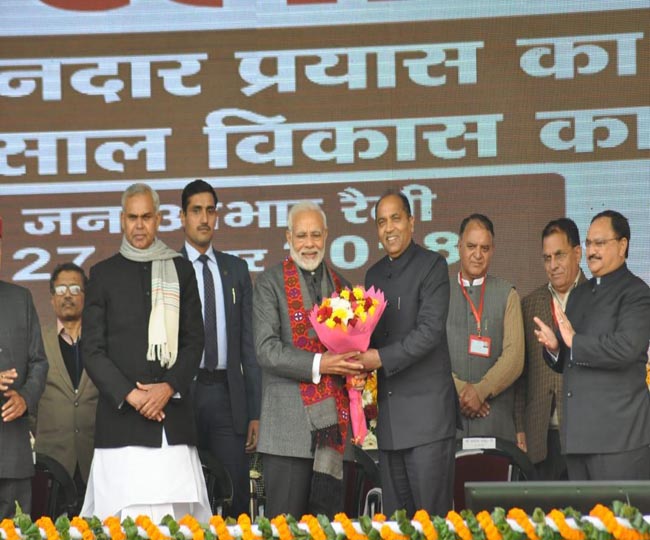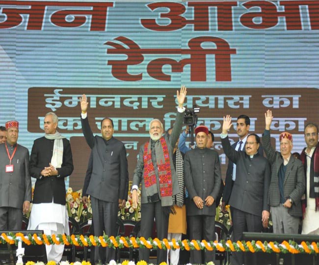 जब भी हिमाचल आने का मौका मिलता है, तो लगता है अपने घर आ गया हूं अपनों के बीच आ गया हूं। बहुत लंबे अरसे तक यहां के कोने कोने में जाकर संगठन का काम करने का सौभाग्य मिला, काफी कुछ सीखने को मिला। जिनके साथ उस समय काम करने का मौका मिला, आज खुशी है कि वे सभी हिमाचल की पहली पंक्ति के नेता बन गए हैं। यह बेहद खुशी का पल है। यह बात प्रधानमंत्री नरेंद्र मोदी ने हिमाचल प्रदेश के कांगड़ा जिला के धर्मशाला में हिमाचल सरकार का एक साल पूरा होने पर आयोजित जन आभार रैली को संबोधित करते हुए कहीे। उन्होंने हिमाचल के शक्तिपीठों को वास्तव में शक्ति बताया और कहा कि यह देव भूमि है औरयहां का हर गांव देवी देवताओं का गांव है। हिमाचल आकर शांति व भाईचारा अनुभव होता है। यह हिमाचल की एक बड़ी पहचान है। यहां शांति की कोख से वीरता पैदा होती है। धर्मशाला ने आज खेल के क्षेत्र में दुनिया भर में अपना नाम बनाया है। बेहद कम समय में यहां का विकास हुआ है। उन्होंने कहा कि हिमाचल में पर्यटन को बढ़ावा देने के लिए हवाई सेवाओं और रेल नेटवर्क का काफी महत्व है और इसके लिए कार्य हो रहा है। मोदी ने कहा कि कांग्रेस किसानों के कर्ज माफी पर झूठ बोल रही है। पंजाब में भी चुनाव से पहले कर्जमाफी के वादे किए गए थे लेकिन वहां भी कर्जमाफी नहीं हुई। कर्नाटक में भी सिर्फ कुछ सौ किसानों की ही कर्जमाफी दी गई। उन्होंने कहा कि कांग्रेस की इस चाल को देशवासी समझते हैं औैर वैसे भी चुनाव जीतने के लिए देश के किसान की पीठ में छुरा भोंकना कब तक चलेगा। मोदी ने कहा कि उनकी सरकार पूरी ईमानदारी से काम कर रही है और भ्रष्टाचार को रोक रही है। हर चोर दरवाजे से हो रही भ्रष्टाचार को रोका जा रहा है। वन रैंक वन पेंशन पर कांग्रेस ने किया गुमराह पीएम मोदी ने कहा कि वन रैंक वन पेंशन पर पूर्व की कांग्रेस सरकार ने सेना के जवानों को गुमराह किया। उन्होंने कहा कि कांग्रेस जैसे अब किसानों को गुमराह कर रही है, ठीक उसी तरह पहले जवानों को भी गुमराह किया था। उन्होंने कहा कि उस सरकार ने केवल लोगों की आंखों में धूल झोंकने का ही कार्य किया था। अब कर्ज माफी के नाम पर कांग्रेस किसानों से भी झूठ बोल रही है।प्रधानमंत्री नरेंद्र मोदी ने कहा कि कांगड़ा की कांगड़ी धाम को भी नहीं भूला हूं। इस दौरान उन्होंने पूर्व पीएम अटल बिहारी वाजपेयी को भी याद किया। उन्होंने कहा कि हिमाचल में रेल नेटवर्क के लिए करोड़ों रुपये खर्च किए जा रहे हैं। हिमाचल में पर्यटन को बढ़ावा देने के लिए सरकार कार्य कर रही है। उन्होंने कहा कि इस रैली के लिए प्रदेश भर से हजारों की संख्या में लोग धर्मशाला के पुलिस ग्राउंड पहुंचे हैं यह सरकार की लोकप्रियता को दर्शाते हैं। इससे पहले प्रधानमंत्री नरेंद्र मोदी का धर्मशाला पहुंचने पर 