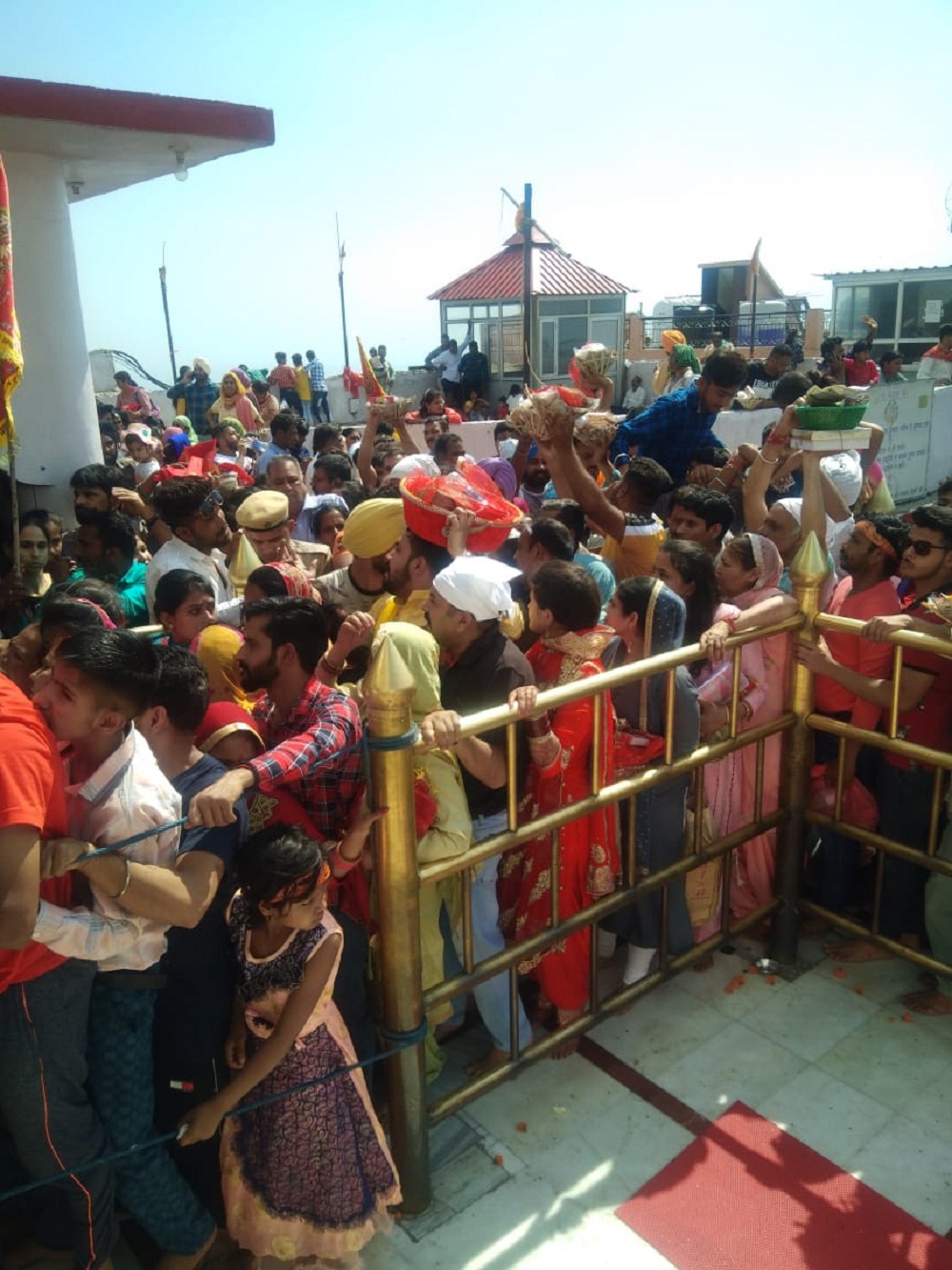 विश्व विख्यात शक्तिपीठ श्री नैना देवी मंदिर में आज रविवार के दिन भारी संख्या में श्रद्धालुओं ने माताजी के दर्शन किए। माताजी का शुभ आशीर्वाद प्राप्त किया और अपने घर परिवार के लिए सुख समृद्धि की कामना की। पंजाब हिमाचल हरियाणा दिल्ली और अन्य प्रदेशों से काफी संख्या में श्रद्धालु माता के दरबार में पहुंचे । हालांकि श्रद्धालुओं का जमावड़ा गत रात से ही लगना शुरू हो गया था और सुबह श्रद्धालुओं ने काफी संख्या में माता जी के दर्शन किए । मंदिर के कबाड़ सुबह 4:00 बजे खोल दिए गए थे जिसके चलते भीड़ पर नियंत्रण बना रहा और आराम से श्रद्धालुओं को माता जी के दर्शन होते रहे। हालांकि दोपहर के बाद श्रद्धालुओं का जमावड़ा लग गया और भीड़ मुख्य द्वार को पार करते हुए फ्लाईओवर से नीचे तक पहुंच गई। श्रद्धालुओं की भीड़ पर नियंत्रण काम करने में होमगार्ड के जवानों पुलिस कर्मियों एवं एक्स सर्विसमैन फौजियों के पसीने छूट गए ।छोटे-छोटे ग्रुप में श्रद्धालुओं को मंदिर भेजा गया और लाइनों में माता जी के दर्शन करवाए गए। मंदिर के समीप बस्सी पठाना के श्रद्धालुओं के द्वारा लगाई गई पानी की छबील के कारण श्रद्धालुओं ने काफी राहत की सांस ली। बस्सी पठाना के समाजसेवी श्रद्धालुओं ने लाइनों में खड़े हुए श्रद्धालुओं को ठंडा पेय जल उपलब्ध करवाया । गर्मी के मौसम में एक पानी का ठंडा गिलास श्रद्धालुओं को काफी राहत पास पहुंचा गया और श्रद्धालुओं ने आराम से लाइन में माता के दर्शन किए । मंदिर अधिकारी दुर्गादास ने भी मंदिर क्षेत्र का निरीक्षण किया और व्यवस्थाओं का जायजा लिया। कुल मिलाकर भारी भीड़ के बावजूद श्रद्धालुओं आराम से दर्शन करके अपने घरों को लौटे।
