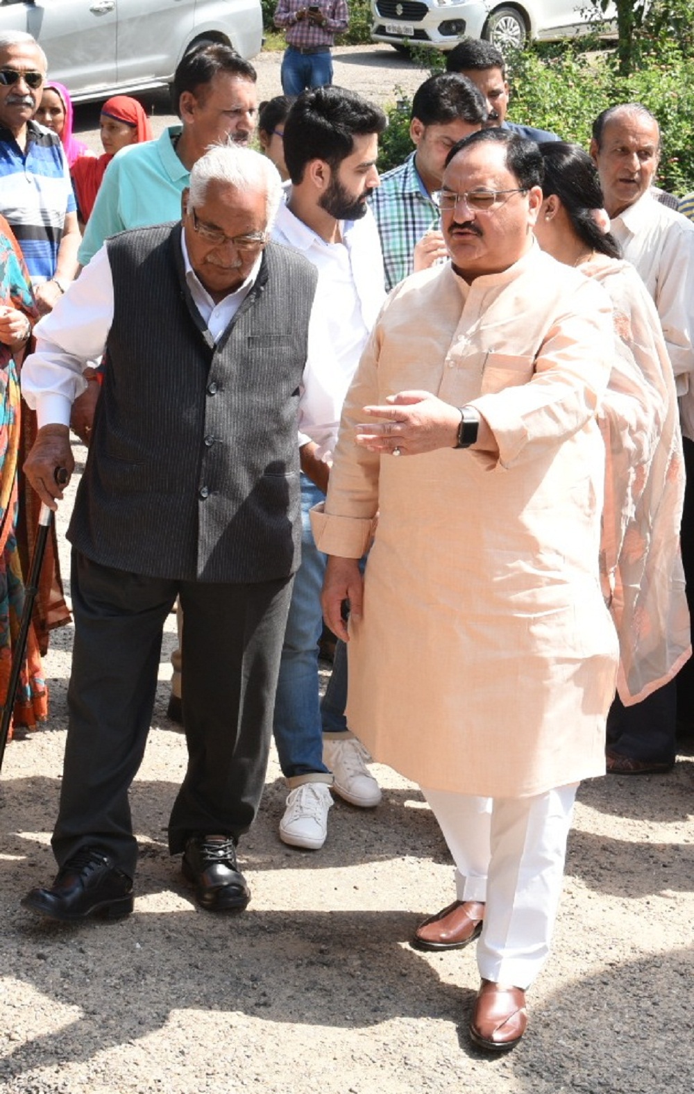 जगत प्रकाश नडडा अपने पिता को मतदान केंद्र की ओर ले जाते हुए