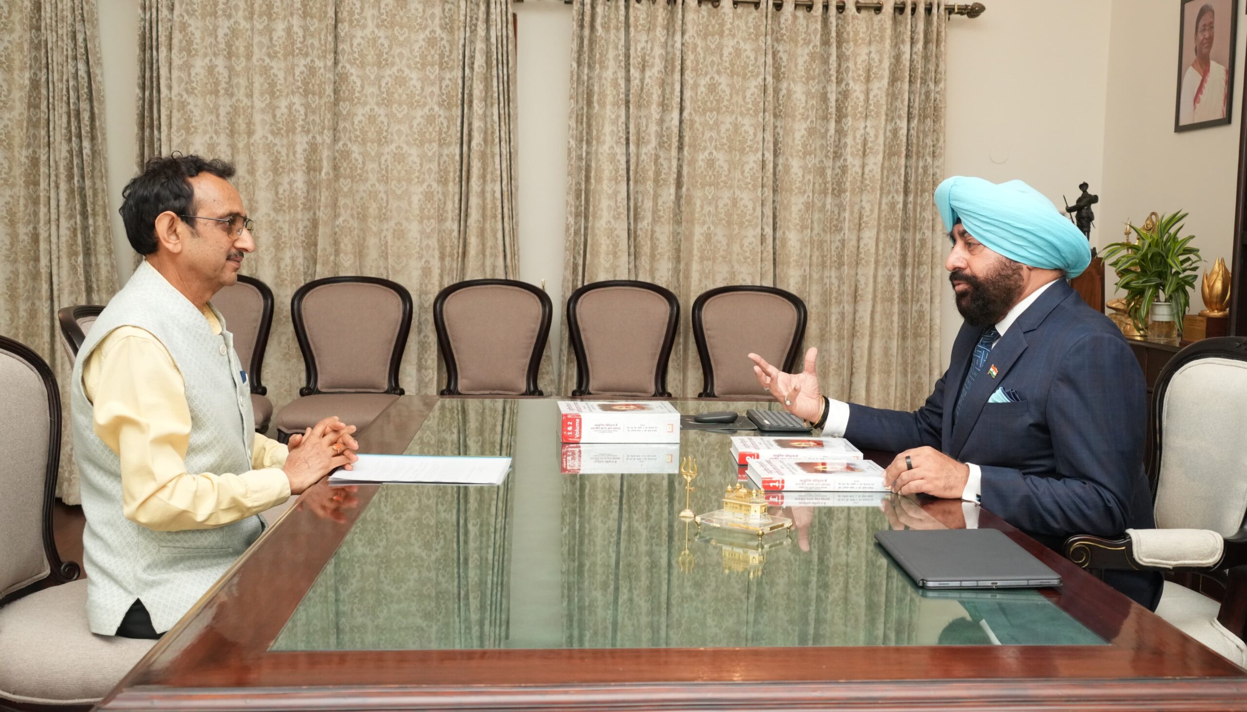 देहरादून,। राजभवन में राज्यपाल एवं कुलाधिपति लेफ्टिनेंट जनरल गुरमीत सिंह (से नि) से श्रीदेव सुमन उत्तराखण्ड विश्वविद्यालय के कुलपति प्रो. एन. के. जोशी ने शिष्टाचार भेंट की। इस अवसर पर कुलपति ने विश्वविद्यालय द्वारा वन यूनिवर्सिटी वन रिसर्च के अंतर्गत तैयार की गई शोध पुस्तक आधुनिक परिदृश्य में भारतीय प्राच्य ज्ञान परंपरा राज्यपाल को भेंट की। राज्यपाल ने विश्वविद्यालय की इस पहल की सराहना करते हुए कहा कि भारतीय प्राच्य ज्ञान परंपरा हमारे देश की अमूल्य धरोहर है, जिसे आधुनिक शोध के माध्यम से जन-जन तक पहुँचाना समय की आवश्यकता है। उन्होंने कहा कि विश्वविद्यालय द्वारा इस दिशा में किया गया शोध कार्य उत्तराखण्ड को ज्ञान के क्षेत्र में नई पहचान दिलाने में सहायक सिद्ध होगा।