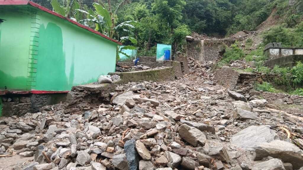 चमोली,। मूसलाधार बारिश ने लोगों की मुश्किलें बढ़ा दी हैं। नंदप्रयाग के थिरपाक गांव के बगल से बहने वाले बरसाती नाले ने तोड़फोड़ मचा दी है। इस नाले का पानी और मलवा घरों के अंदर तक घुस गया। मलबे ने घरों के पास में बने सुरक्षा दीवार का नामोनिशान मिट गया है। रात्रि में हुए इस अतिवृष्टि में घरों में बने शौचालय के बहने की खबर भी सामने आ रही है। नाले के तेज बहाव ने 2 गोशाला भी इसकी चपेट में आए हैं, जिसमें मौजूद 1 बैल और 2 बकरी की मौत हो गई है। साथ ही ग्राम थिरपाक के गरीब लाल जी के 1 बैल और 2 बकरी मलवे की चपेट में आने से मौत के घाट उतर गए। मलवा पूरे खेतों में भर गया है, जिससे फसलों को भी भारी नुकसान पहुंचा है। ग्राम थिरपाक के देवाशीष कुमार, सज्जन लाल मनोहर लाल रोशन कुमार, रघुलाल, गरीब लाल, जिनके मकान को अभी भारी खतरा बना हुआ है। नंदानगर में चुफलागाड़ उफान पर थी तो दूसरी तरफ नंदाकिनी नदी भी विकराल रूप में थी, रात को हुई भारी बारिश से और कितनी जगह नुकसान हुआ है इसकी अभी कोई खबर नहीं है।