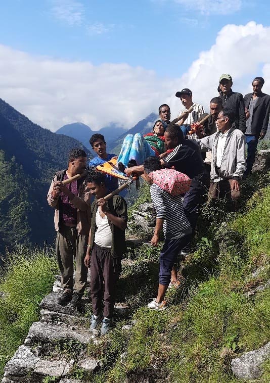 जानकारी के मुताबिक, पिथौरागढ़ के गोल्फा गांव की खिला देवी पत्नी लक्ष्मण सिंह कोरंगा (उम्र 65 वर्ष) मवेशियों के लिए घास लेने जंगल गई थी। जहां घास काटते वक्त गिरकर गंभीर रूप से घायल हो गईं। सड़क से गांव की दूरी 5 किमी होने और पैदल खड़ंजा मार्ग होने के कारण किसी वाहन की पहुंच वहां संभव नहीं था। ऐसे में गांव के युवाओं ने चादर और लकड़ी के डंडों से एक अस्थायी डोली तैयार की। जिसके जरिए घायल महिला को कंधों पर लादकर सड़क तक लाए।