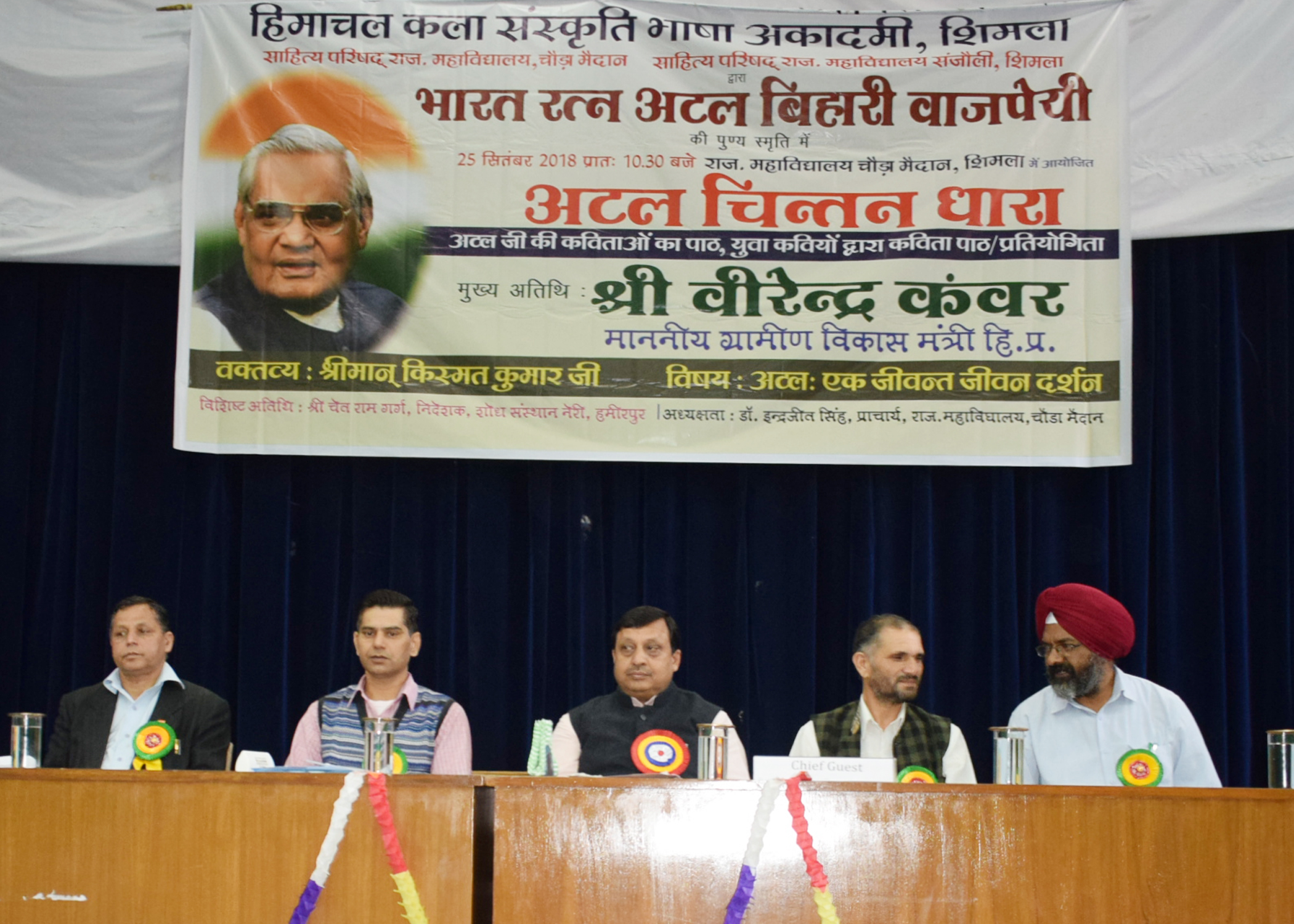 हिमाचल कला संस्कृति भाषा अकादमी शिमला, साहित्य परिषद, राजकीय महाविद्यालय चौड़ा मैदान शिमला एवं साहित्य परिषद, राजकीय महाविद्यालय संजौली द्वारा भारत रत्न अटल बिहारी वाजपेयी की पुण्य स्मृति में आज राजकीय महाविद्यालय चौड़ा मैदान शिमला में अटल चिन्तन धारा विषयक गोष्ठी कविता पाठ एवं प्रतियोगिता का आयोजन किया गया। ग्रामीण विकास मंत्री वीरेन्द्र कंवर इस कार्यक्रम के मुख्य अतिथि तथा निदेशक शोध संस्थान नेरी, हमीरपुर चेत राम गर्ग विशिष्ट अतिथि थे।