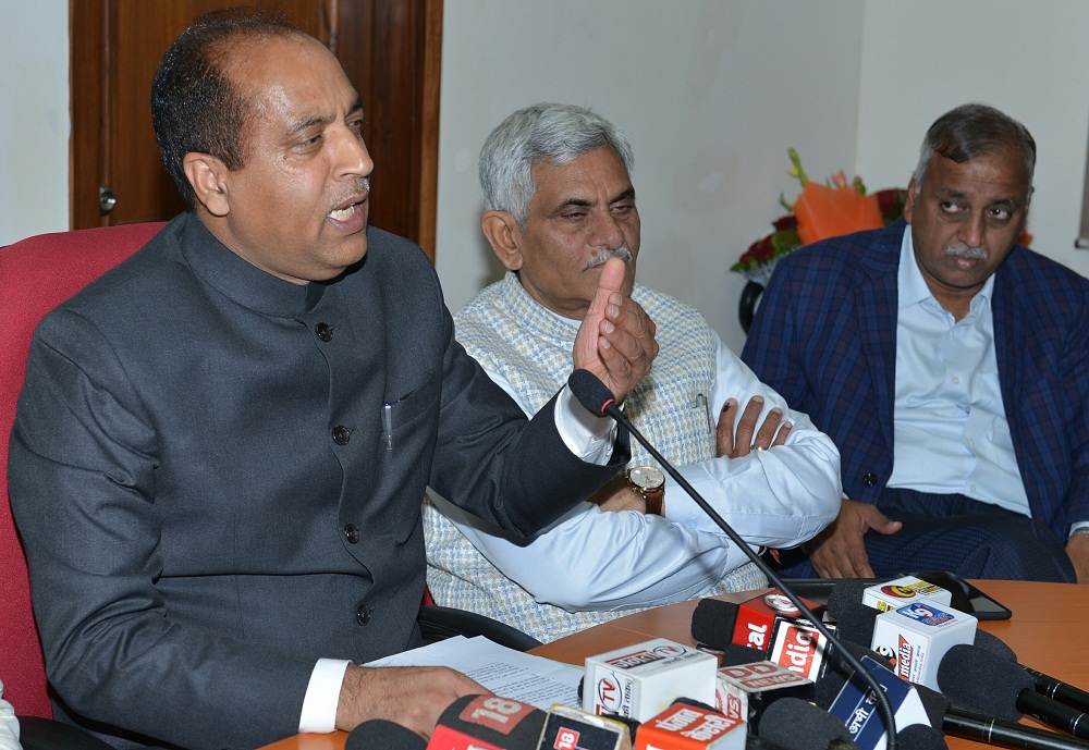 पत्रकारों को संबोधित करते हुए हिमाचल के मुख्यमंत्री जयराम ठाकुर