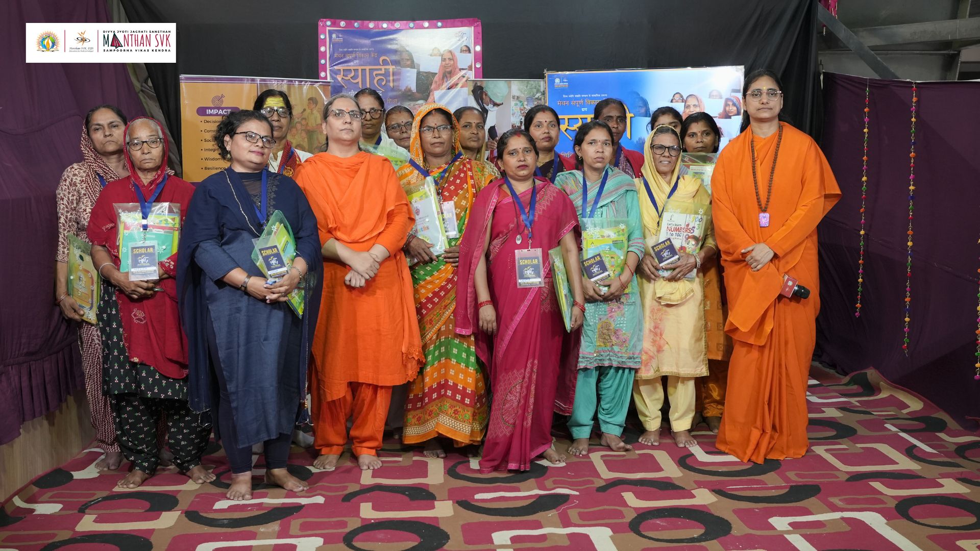 इस अवसर पर साध्वी दीपा भारती जी, संयोजिका- मंथन प्रकल्प तथा साध्वी रचिता भारती जी ने सभी शिक्षार्थी महिलाओं को स्टेशनरी किट्स व स्कॉलर आईडी कार्ड्स प्रदान किए। इन कार्ड्स को हाथों में पाकर अनेक महिलाओं की आँखें नम हो उठीं। उन्होंने साझा किया कि किस प्रकार अशिक्षा के कारण उन्हें जीवन भर अपने ही परिजनों के उपेक्षापूर्ण व्यवहार सहने पड़े। भाव-विभोर होकर उन्होंने दिव्य गुरु अशुतोष महाराज के प्रति कृतज्ञता प्रकट की-ष्हमने कभी सोचा भी न था कि इस आयु में हमें शिक्षा मिलेगी। स्वप्न देखना छोड़ चुके थे, पर आज दिव्य गुरु की कृपा और उनकी सर्वसमावेशी दृष्टि ने उस स्वप्न को वास्तविकता में बदल दिया।ष् अन्त में, महिलाओं ने अपने नवनिर्मित कक्षा-कक्ष का उद्घाटन किया और वहीं उनकी प्रथम पाठशाला भी आरम्भ हुई। प्रथम पाठ में उन्होंने ‘सीधी खड़ी रेखा’, ‘लेटी रेखा’, ‘आधा गोला’, ‘पूरा गोला’ और अन्ततः हिन्दी स्वर ‘अ’ लिखना सीखा। इस उद्घाटन समारोह में आसपास के गाँवों से 100 से अधिक महिलाएँ उपस्थित रहीं, जो इस नवप्रभात की साक्षी बनीं। ‘स्याही’ का यह सशक्त कदम दर्शाता है कि मंथन केवल बाल शिक्षा व व्यावसायिक प्रशिक्षण तक सीमित नहीं है, अपितु वयस्क साक्षरता की दिशा में भी समाज को एक नया प्रकाश पथ प्रदान कर रहा है।