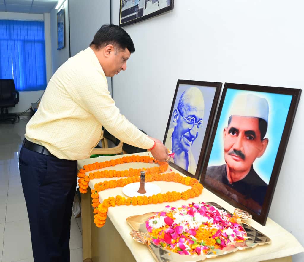 jसूचना विभाग में गांधी जी और शास्त्री जी के चित्र पर पुष्पांजलि अर्पित कर उन्हें नमन किया गया