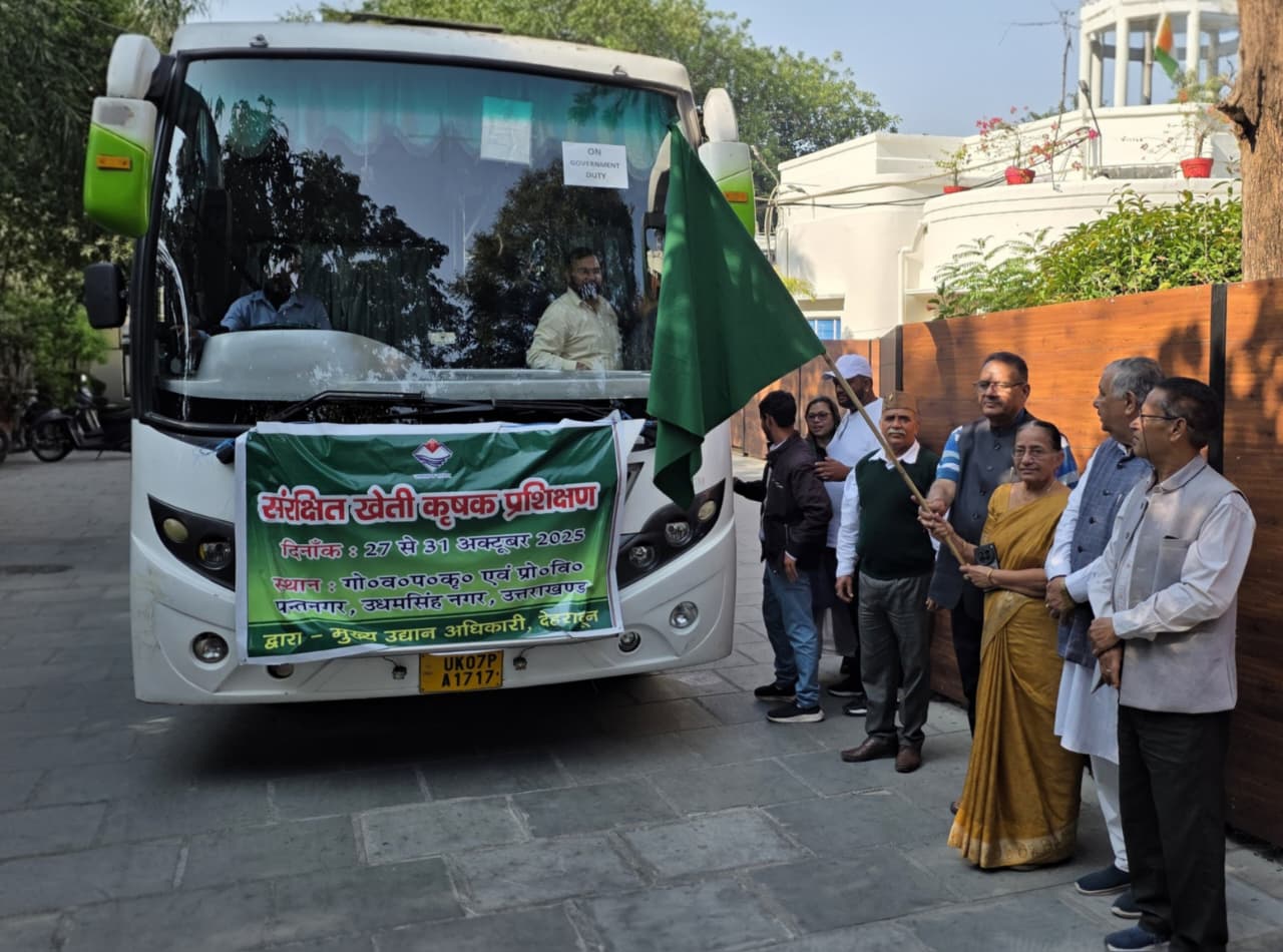 देहरादून,। जनपद देहरादून के 28 प्रगतिशील सब्जी उत्पादक कृषकों के समूह को प्रदेश के कृषि एवं उद्यान मंत्री गणेश जोशी ने आज गोविन्द बल्लभ पंत कृषि एवं प्रौद्योगिकी विश्वविद्यालय, पंतनगर में पांच दिवसीय संरक्षित खेती पर प्रशिक्षण हेतु बस को हरी झंडी दिखाकर रवाना किया।