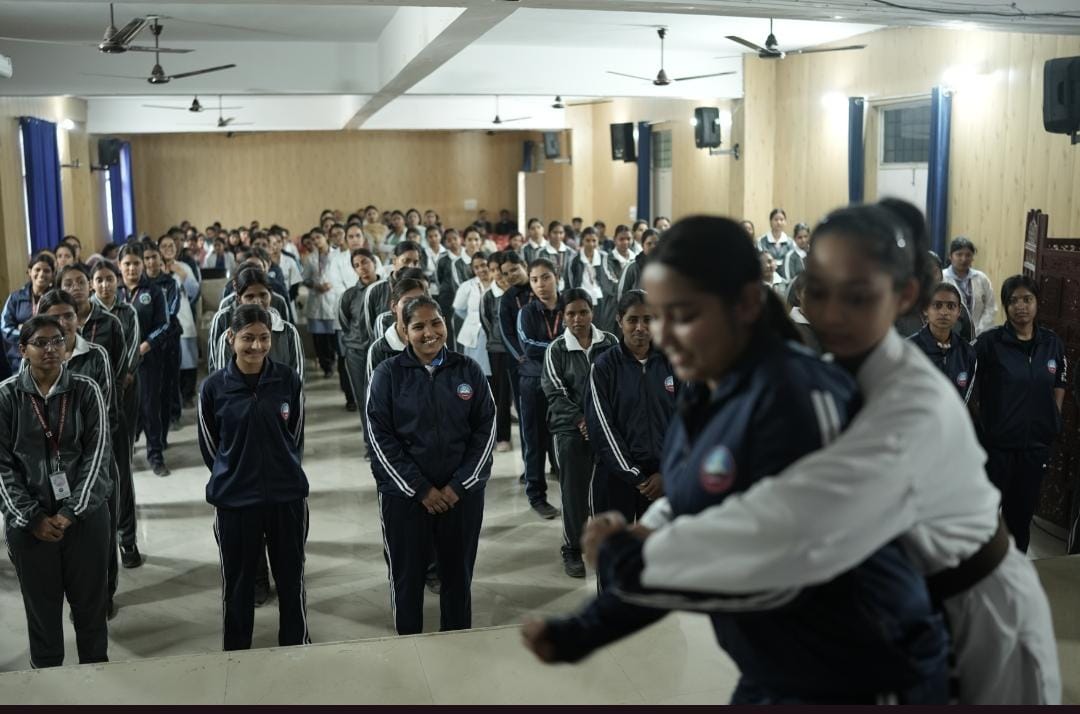 कार्यक्रम के अन्तर्गत उत्तराखण्ड कराटे अकादमी के तत्वाधान में छात्राओं एवं संकाय को आत्मरक्षा का प्रशिक्षण एवं गुर सिखाया गया स कराटे अकादमी के निदेशक राजेन्द्र गुप्ता ने कहा कि समाज मे नारी को आत्मविश्वास से पूर्ण एवं शारीरिक और मानसिक रूप से मजबूत बने रहने के लिए कराटे सहित आत्मरक्षा के सभी दाव पेंच सीखने की नितांत आवश्यकता है। संस्था की उपाध्यक्ष विदुषी निशंक ने अपने संबोधन में कहा कि भारत के प्रथम नागरिक के रूप मे राष्ट्रपति के पद पर महिला का होना ही इस बात को बल देता है की महिला समाज की एक मजबूत रीढ़ बन चुकी है और देश की सभी सेवाओं में महिलाओं की सहभागिता अग्रणी पंक्ति में है जो अत्यंत ही सुखद है, जिसे निरंतर शिक्षा और सामाजिक जागरूकता से और आगे बढ़ाना है। उन्होंने यह भी कहा कि आज भारत विश्व के सभी देशों से भिन्न इसलिए भी है कि यहां नारी की पूजा होती है और उसे सम्मान दिया जाता है स देवी-देवताओं में भी जहां ज्ञान और समृद्धि की प्रतीक सरस्वती और लक्ष्मी हैं वहीँ रौद्रता का प्रतीक माँ काली और दुर्गा भी है। कार्यक्रम के अंत में विश्वविद्यालय के कुलपति प्रो. गोविन्द सिंह रजवार ने कहा कि यह विश्विद्यालय समय समय पर महिला सशक्तिकरण से जुड़े हुए अनेक कार्यक्रम आयोजित कर जनजागरुकता एवं नई पीढ़ी को अनेकों अवसर प्रदान कर रहा है। कार्यक्रम का संचालन डॉ. साक्षी ने किया, जबकि धन्यवाद ज्ञापन डॉ. पल्लवी वार्ष्णेय द्वारा प्रस्तुत किया गया। इस अवसर पर प्रतिकुलपति आर. सी सुन्द्रियाल, संस्था के सचिव बालकृष्ण चमोली, कुलसचिव अरविंद अरोड़ा, संयुक्त निदेशक प्रदीप कोठियाल, प्राचार्या अंजना विलियम्स सहित संकाय प्रतिनिधि एवं छात्र-छात्राएं उपस्थित रहे।