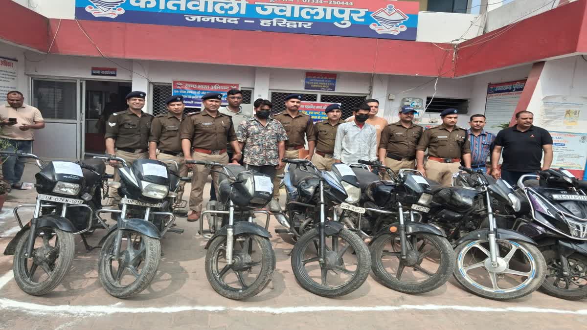 हरिद्वार,। जिले में पुलिस ने अंतरराज्यीय वाहन चोर गिरोह का पर्दाफाश किया है। पुलिस ने गिरोह के दो सदस्यों को भी गिरफ्तार किया है। आरोपियों के कब्जे से पुलिस को चोरी की दस बाइकें बरामद हुई है। एसएसपी नवनीत सिंह भुल्लर ने इस पूरे मामले का खुलासा किया। एसएसपी नवनीत सिंह भुल्लर ने बताया कि पांच मार्च को शुभम कुमार पुत्र जहारू सिंह निवासी इमलीखेड़ा थाना पिरान कलियर ने पुलिस को तहरीर दी थी। अपनी तहरीर में शुभम कुमार ने बताया था कि उसकी मोटर साइकिल चार मार्च को महाराजा फर्नीचर ऊंचा पुल ज्वालापुर के पास से चोरी कर ली गई है। इस संबंध में कोतवाली ज्वालापुर में मुकदमा दर्ज किया गया।